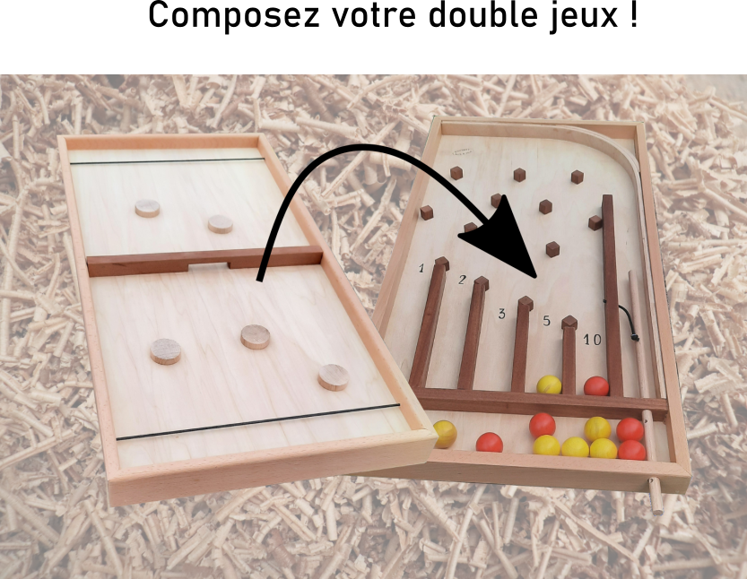 A partir de 5 jeux de bases, vous pouvez choisir votre composition en recto verso. Imaginez, un jeux géant en bois sur lequel vous pouvez choisir un Speed trappe d'un coté et un Flipper Aérobille de l'autre ! 2 Styles de jeux différents, un jeu de face à face et un jeu de précision Tout cela sur Concept Bois et jeux fabricant de jeux en bois situé en Mayenne